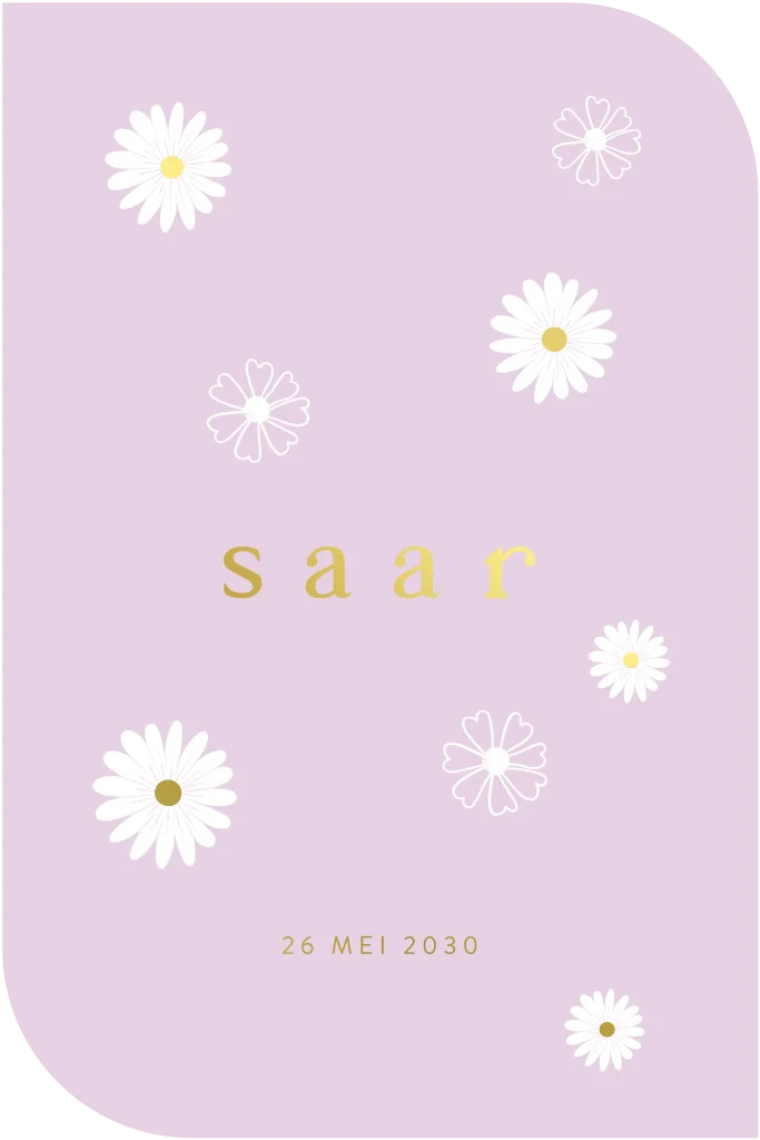 Paars geboortekaartje in speciale vorm met bloemen en goudfolie voor een meisje