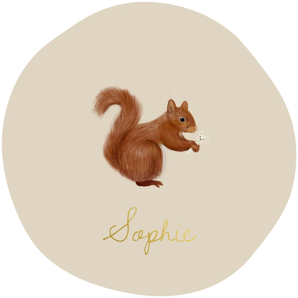 Dit speels ronde geboortekaartje voor een meisje of jongen heeft een mooie beige achtergrond met een schattig eekhoorntje. Het minimalistische ontwerp en de naam in goudfolie maken dit babykaartje stijlvol en bijzonder om de geboorte van jullie dochter of zoon aan te kondigen.