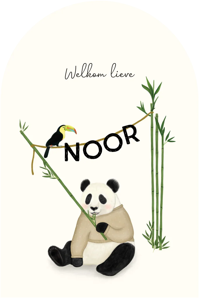 Een lief geboortekaartje voor een dochtertje. Het boogvormige kaartje heeft een schattige illustratie van een pandabeer op de voorkant. Het pandabeertje krijgt gezelschap van een toekan. De zachte beige kleuren maken het een sfeervol geheel.