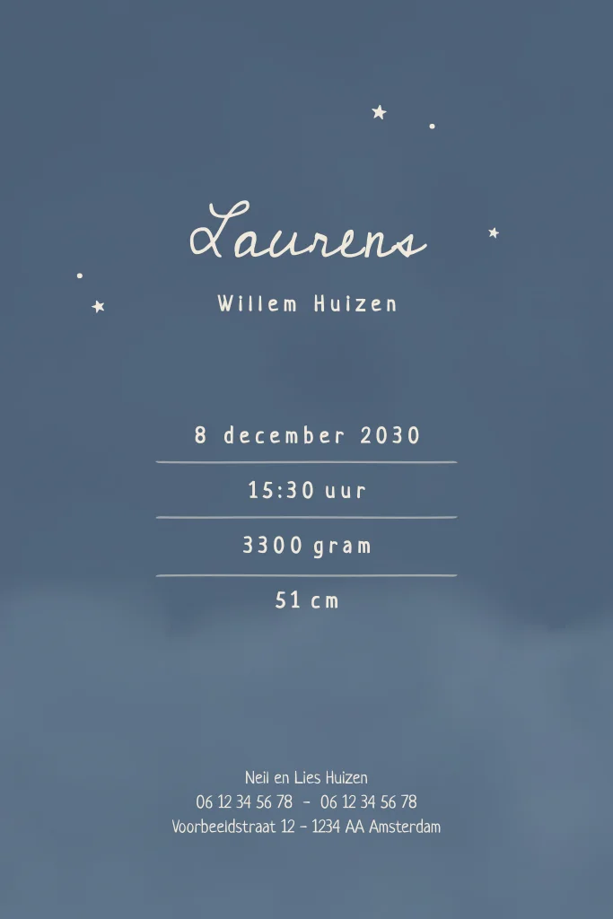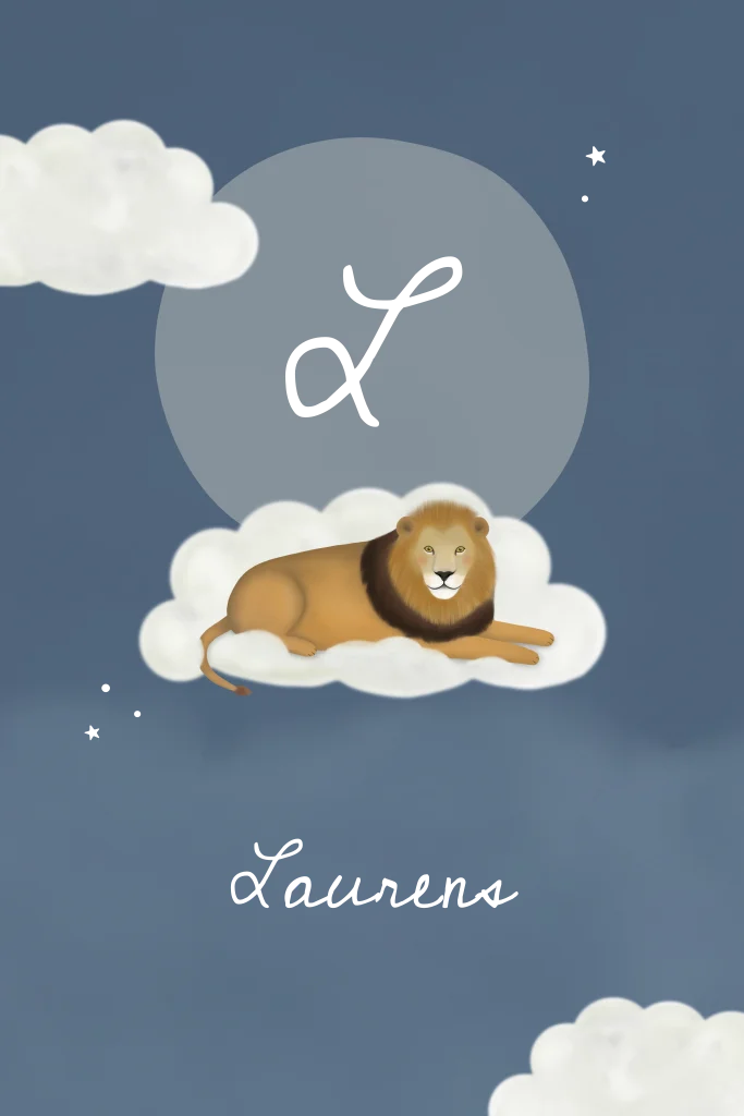 Dit stijlvolle geboortekaartje voor een jongen heeft een grijsblauwe lucht en een schattig leeuwtje dat op een wolk ligt. Omringd door wolken en fonkelende sterren in goudfolie, krijgt het ontwerp een luxe en speelse uitstraling. Een uniek en lief babykaartje om de geboorte van jullie zoon op een bijzondere manier aan te kondigen.