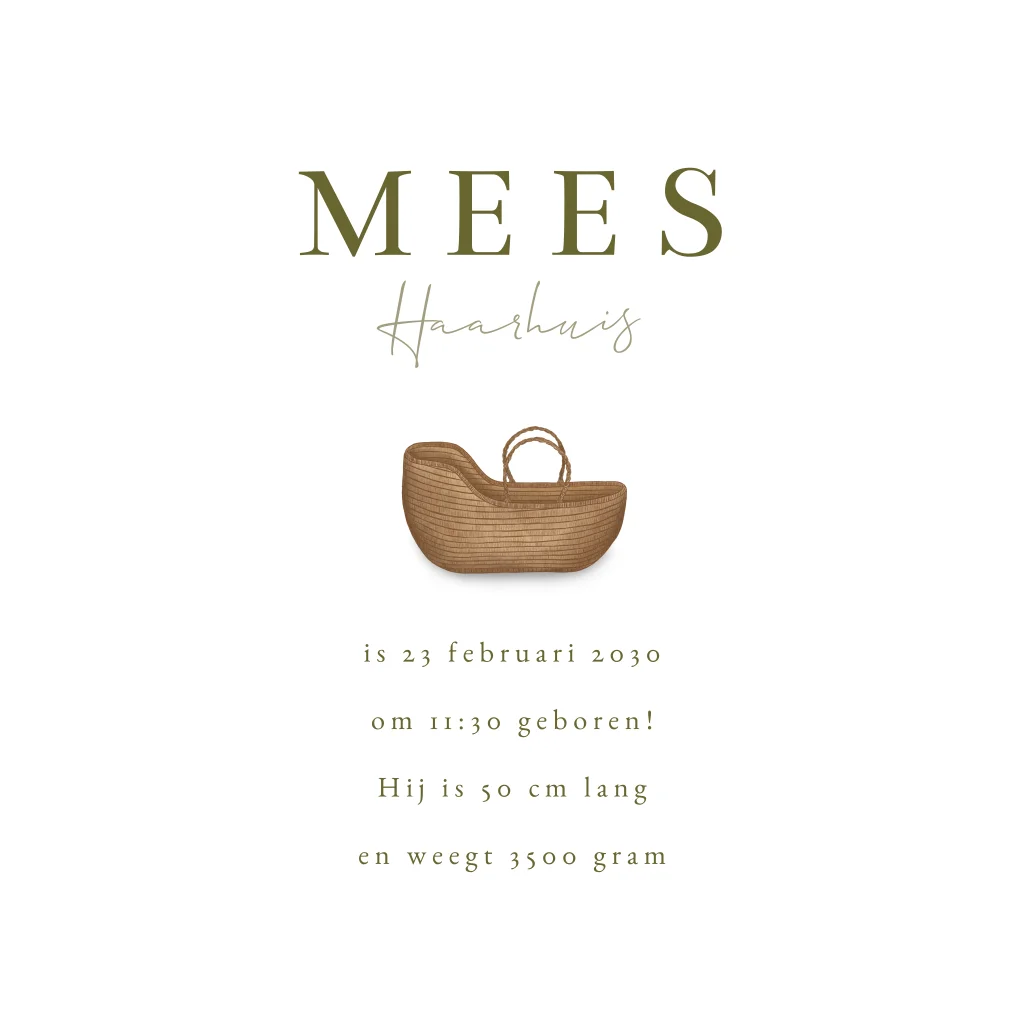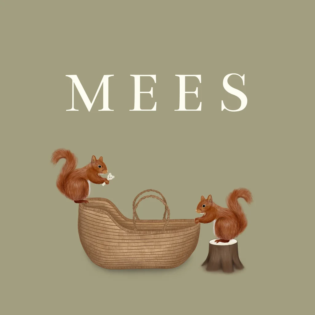 Dit rustige geboortekaartje heeft een warme olijfgroene kleur. Schattige eekhoorntjes zitten rondom een wiegje. Een lief ontwerp met een natuurlijke en serene uitstraling.