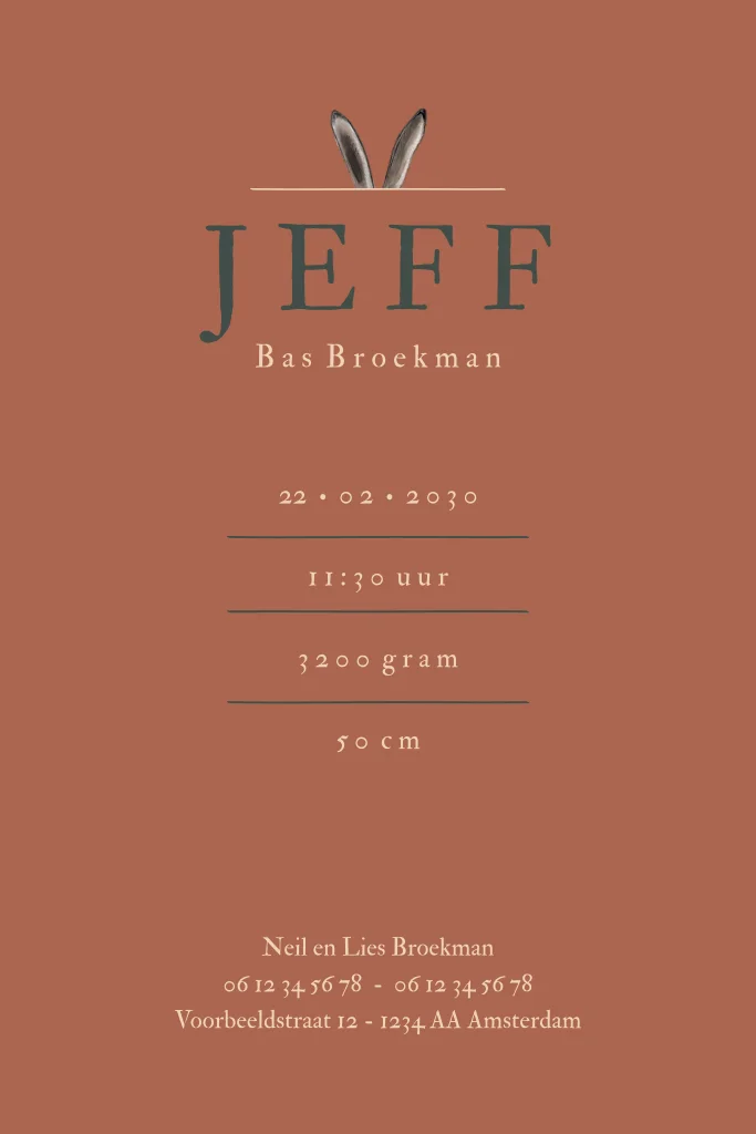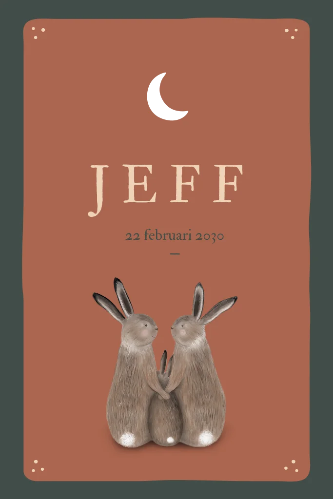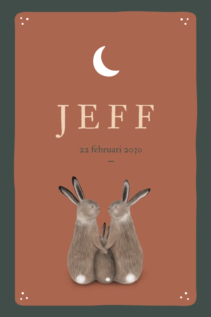 Dit stoere geboortekaartje voor een jongen heeft een donkergroene rand en een roestbruine achtergrond. De schattige haasjesfamilie samen met de goudfolie maan maken het ontwerp compleet. Een uniek en stijlvol babykaartje om de geboorte van jullie zoon op een bijzondere manier aan te kondigen.