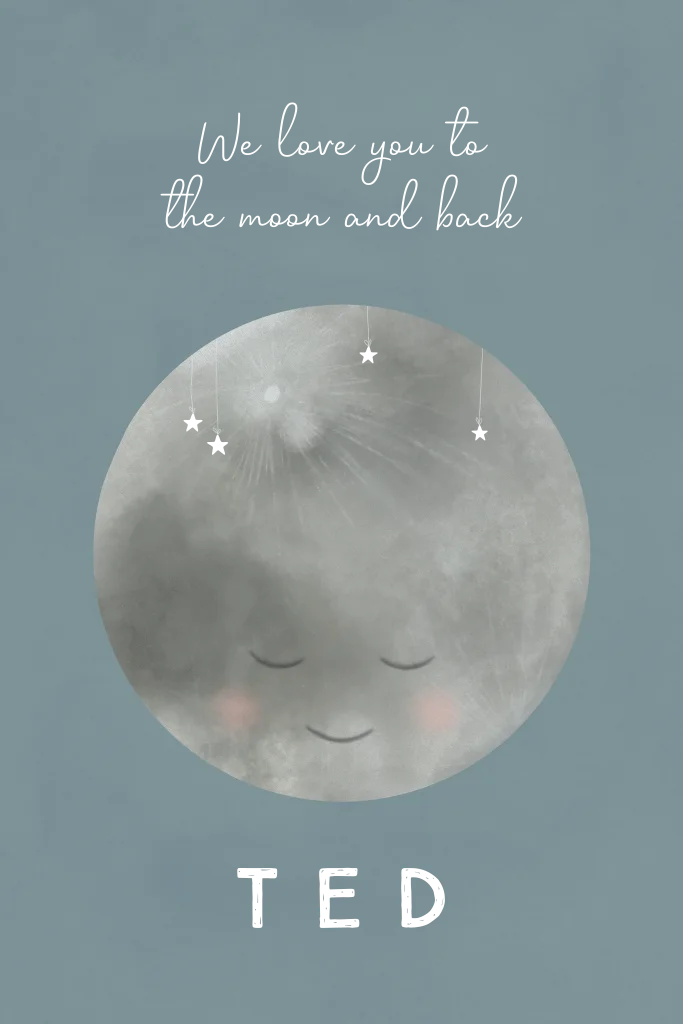 Een stoer vergrijsd blauw geboortekaartje met een prachtige maan en fonkelende sterretjes. Het goudfolie maakt het babykaartje voor jullie zoon helemaal af.