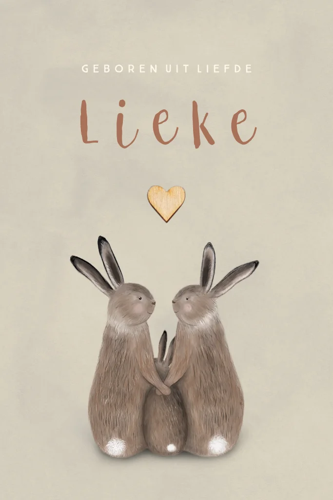 Op zoek naar een lief en warm geboortekaartje voor een meisje? Kies voor deze schattige haasjes met een speels lettertype op een beige achtergrond. Maak het babykaartje compleet met een echt houten hartje, dat je eenvoudig kunt meebestellen.