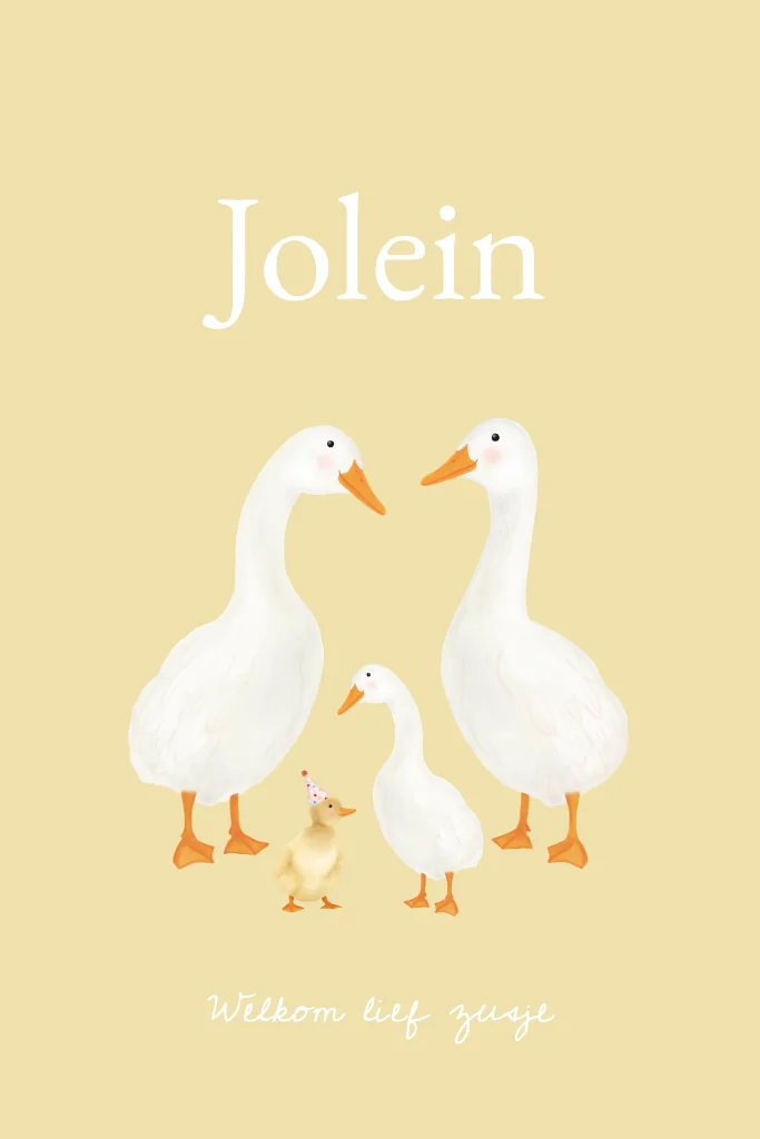 Lief geboortekaartje voor jullie tweede kindje met een schattige illustratie van een gans gezinnetje. Ouders, oudste kindje en zusje zijn afgebeeld op een boter gele achtergrond. Ideaal om de geboorte van jullie baby op een bijzondere manier aan te kondigen.