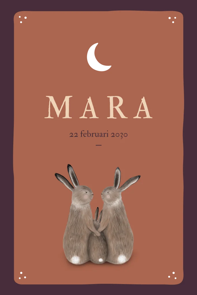 Dit stijlvolle geboortekaartje voor een meisje heeft een donkerpaarse rand en een terracotta achtergrond. De schattige haasjesfamilie samen met de goudfolie maan maken het ontwerp compleet. Een uniek babykaartje om de geboorte van jullie dochter op een bijzondere manier aan te kondigen.