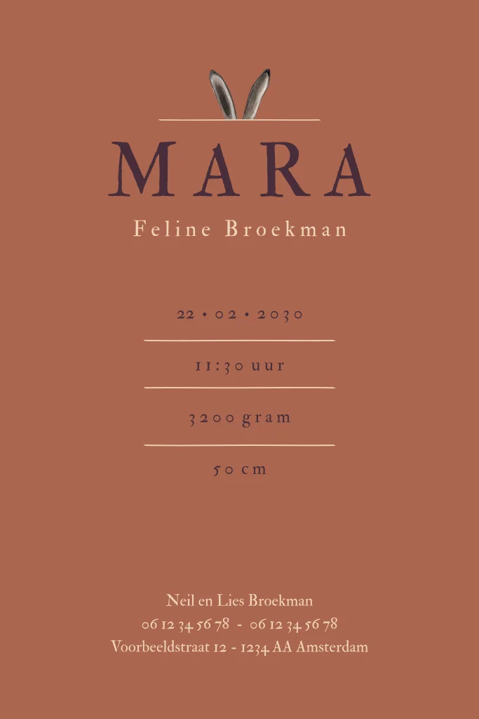 Geboortekaartje meisje in donkerpaars en terracotta met haasjes en