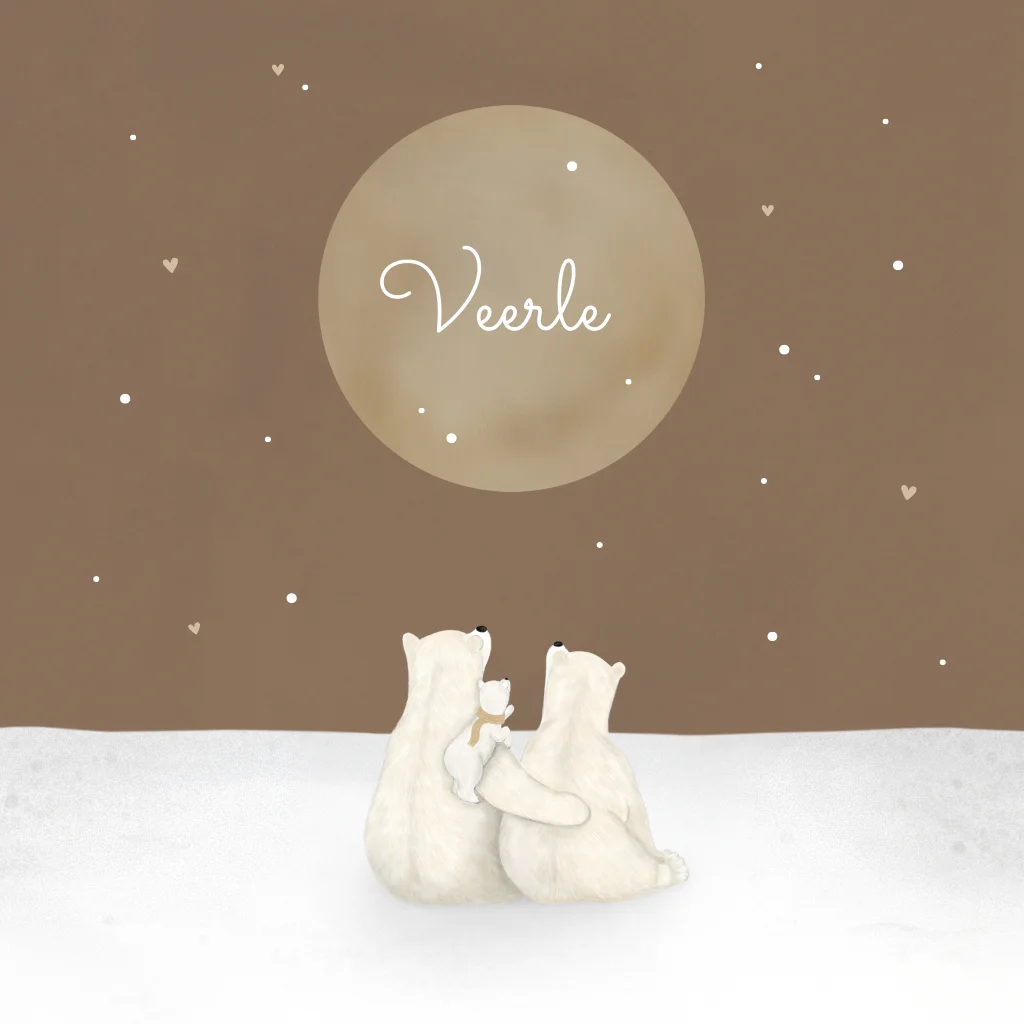 Sfeervol geboortekaartje met drie ijsberen in een winters landschap. Het baby ijsbeertje zit op de schouder van de ouder en wijst naar de sterrenhemel met volle maan. Dit unieke babykaartje in trendy bruintinten is perfect voor een liefdevolle geboorteaankondiging.