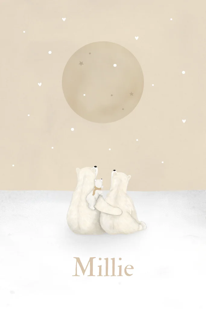 Een illustratief geboortekaartje met drie ijsberen in een sfeervol winters landschap. Het baby ijsbeertje zit op de schouder van de ouder en wijst naar de sterrenhemel met volle maan. Dit unieke babykaartje in zachte beige tinten met hartjes is perfect voor een liefdevolle geboorteaankondiging.