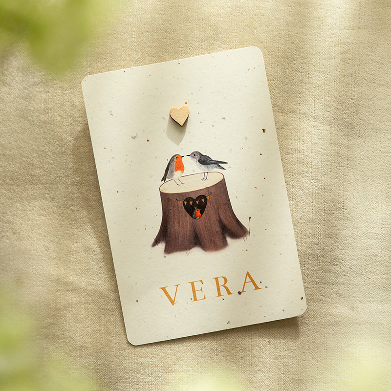 Babykaartje met vogeltjes op boomstam en écht houten hartje op eco papier