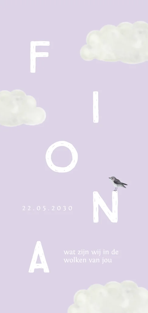 Dromerig geboortekaartje met wolken, vogeltje en lila lucht