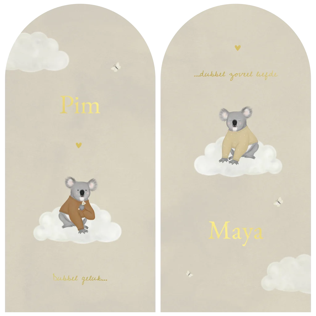 Twee lieve unisex geboortekaartjes met schattige koala’s op een wolk, perfect op elkaar afgestemd. De sierlijke arch-vorm en goudfolie-details maken de kaartjes voor jullie tweeling extra speciaal!