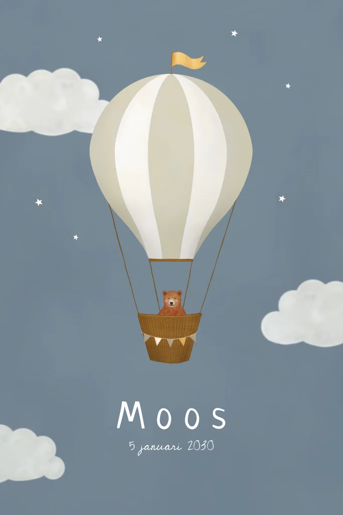 Premium geboorteposter met een schattig beertje in een luchtballon. De sterren en naam staan in goudfolie. Formaat 30 x 20 cm, gedrukt op stevig 260 grams coated karton en plat geleverd.