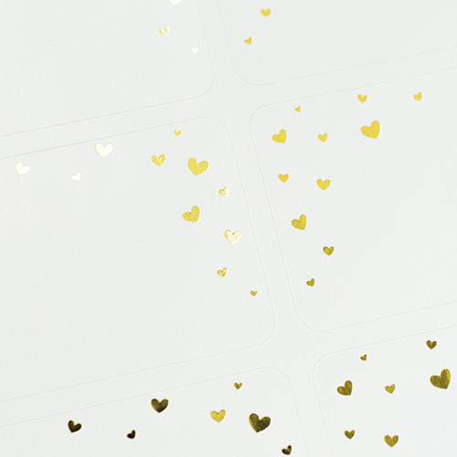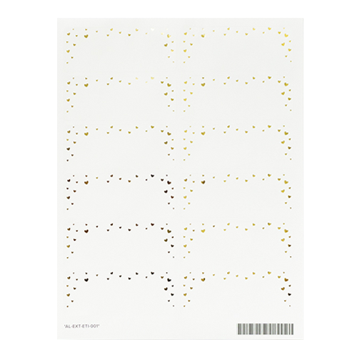 Een vel met 12 adresstickers op glanzend wit papier. Elke sticker is mooi versierd met goudfolie hartjes. Op de adressticker kun je zelf het adres schrijven of printen. Formaat: sticker: 43mm hoog x 109mm breed Vel: 225mm breed x 303mm hoog