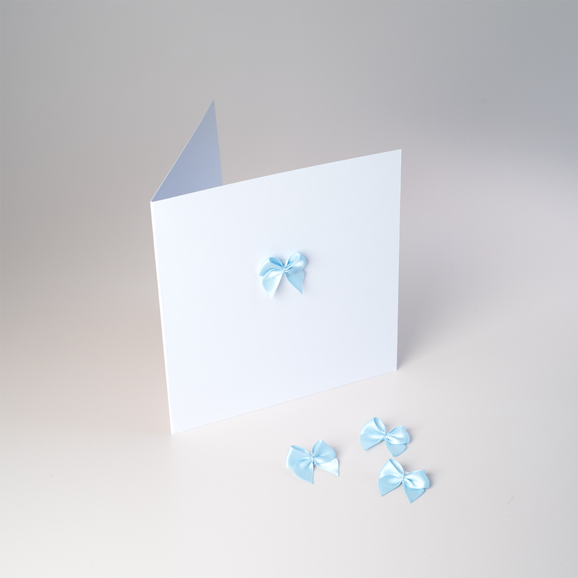 Blauwe satijnen strikjes met plakstrip (25 stuks). Formaat: 2,5 cm (breedte) x 2,5 cm (hoogte).