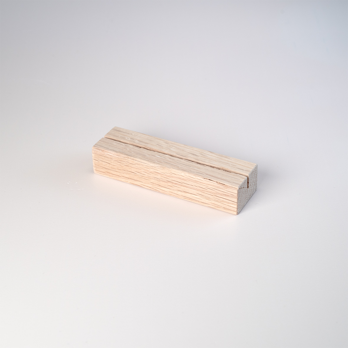 Eikenhouten kaarthouder. Formaat: 10 cm (lengte) x 3 cm (breedte) x 2 cm (hoogte). De gleuf is 2 mm breed.