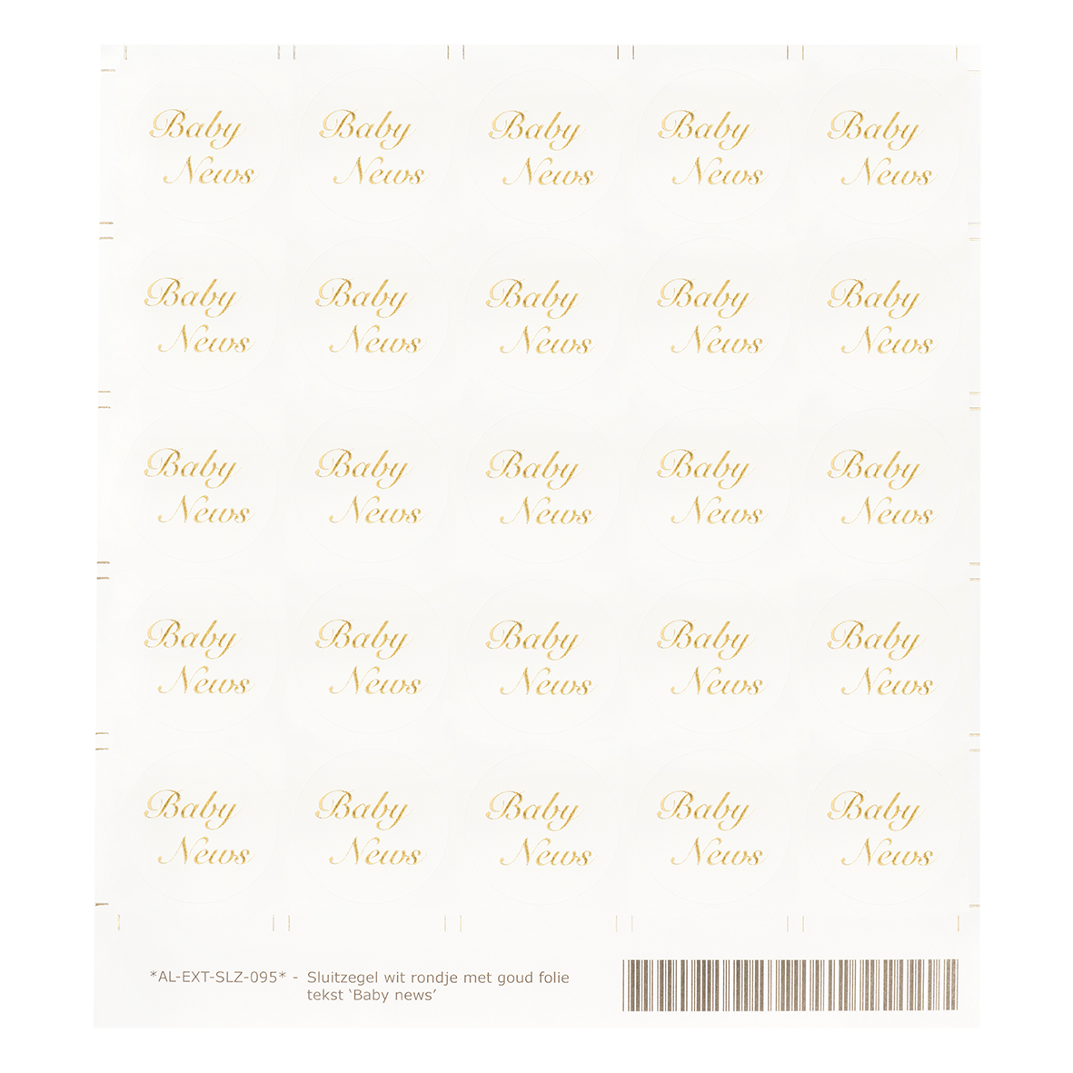 Witte sluitsticker met in goudkleurige sierlijke letters de tekst Baby News