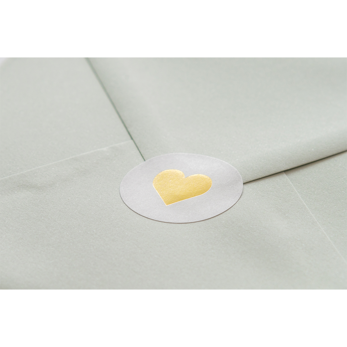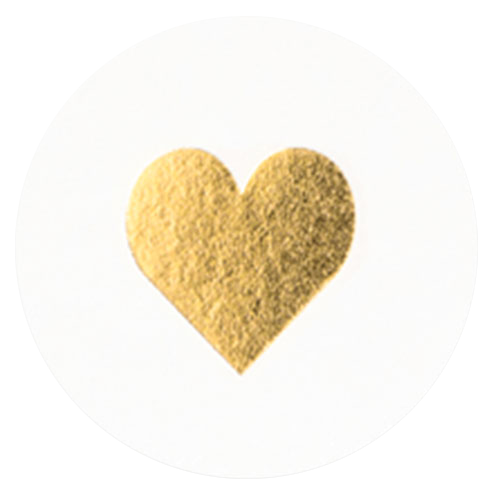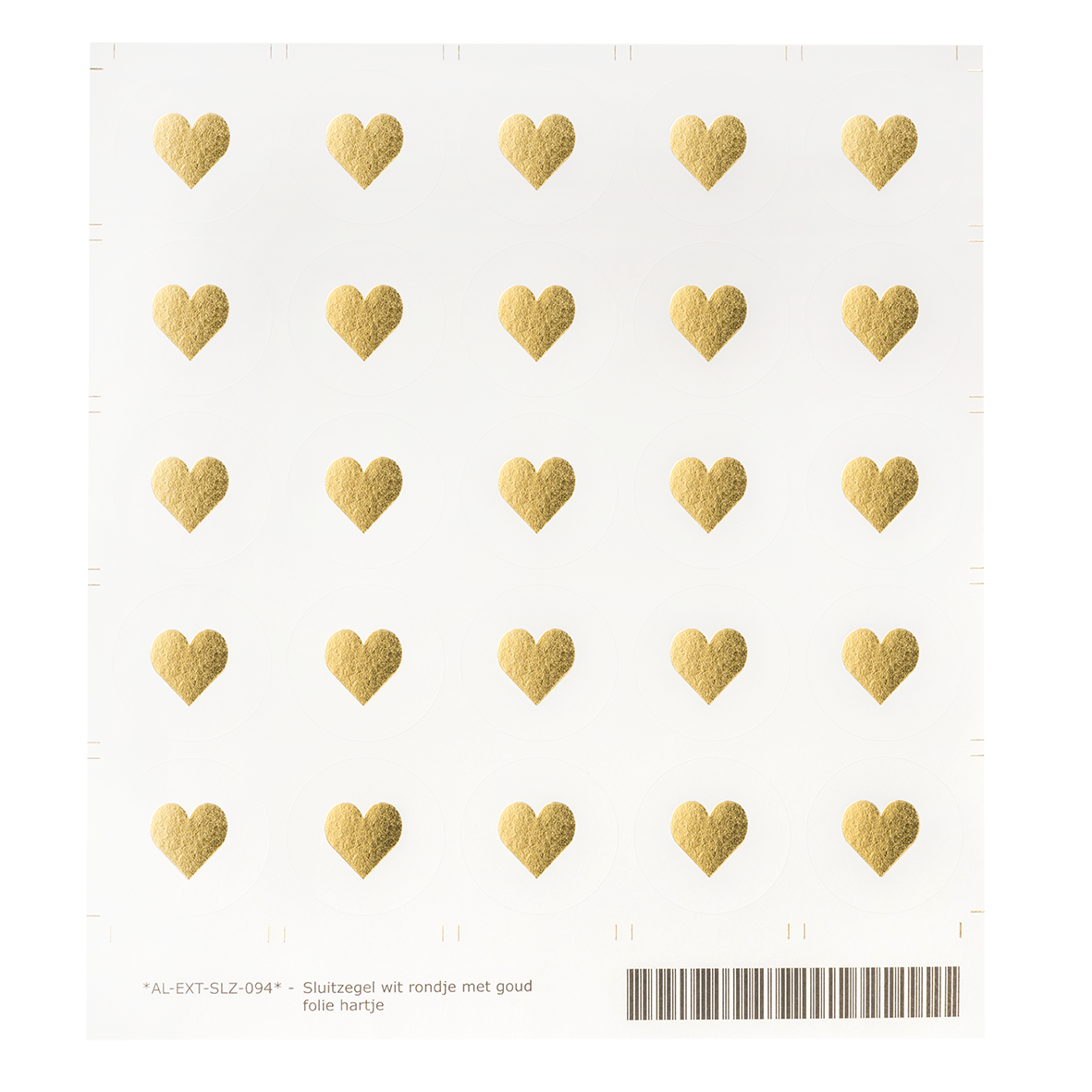 Witte sluitzegel met in het midden een echt goudfolie hartje. Geleverd per velletje van 25 stickers.